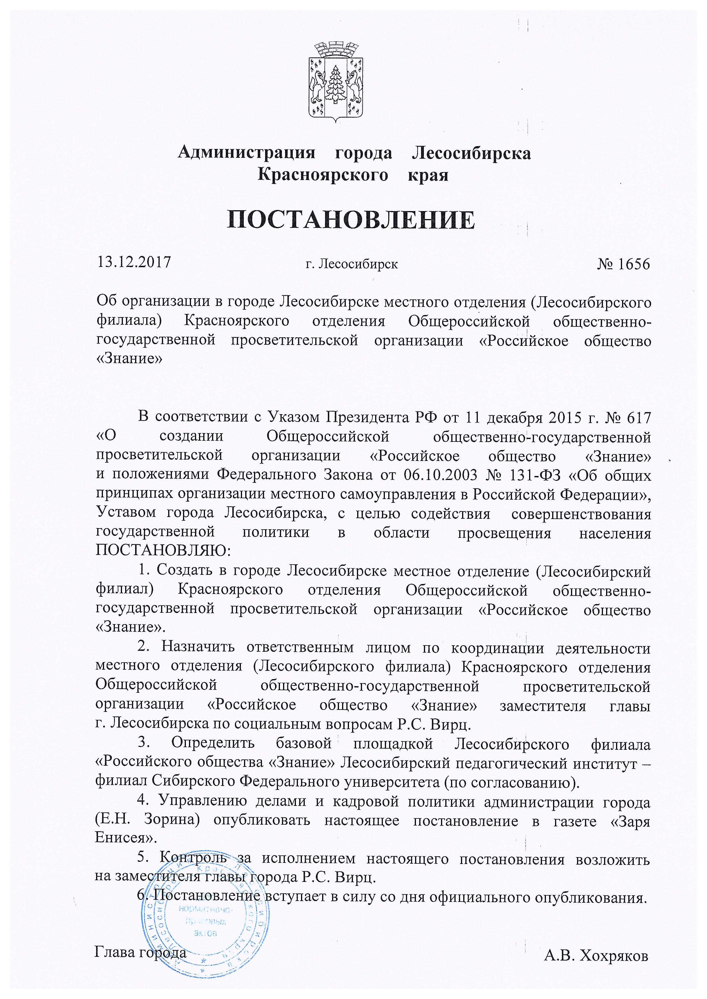 Постановление Администрации города Лесосибирска Красноярского края от 13.12.2017 №1656 «Об организации в городе Лесосибирске местного отделения (Лесосибирского филиала) Красноярского отделения Общероссийской общественно-государственной просветительской организации «Российское общество «Знание» post_znanie.jpg (743 Загрузок)